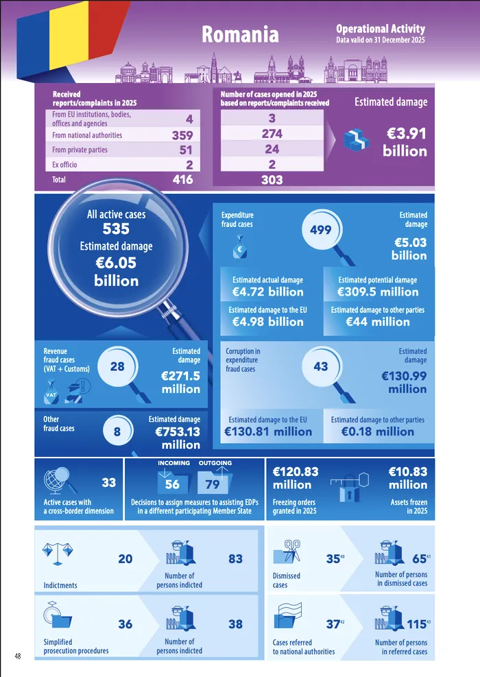În ceea ce privește România, datele din raportul EPPO indică o presiune imensă asupra bugetului european și național. Cu un prejudiciu estimat la 6,5 miliarde de euro în cadrul a 535 de cauze aflate în lucru, România rămâne un punct central în activitatea procurorilor europeni. În cursul anului 2025, au fost deschise 303 cazuri noi în urma plângerilor primite, reușindu-se obținerea a 18 condamnări definitive. Din prejudiciul total investigat de EPPO la nivel european (peste 67 miliarde de euro), mai mult de două treimi provine din fraude cu TVA și taxe vamale, activități descrise de Kövesi drept o „industrie criminală tolerată prea mult timp”.