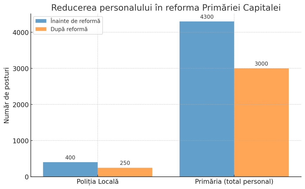Reorganizarea vizează și reducerea personalului din aparatul administrativ al Primăriei. De la 4.300 de angajați, numărul acestora ar urma să scadă la aproximativ 3.000.
