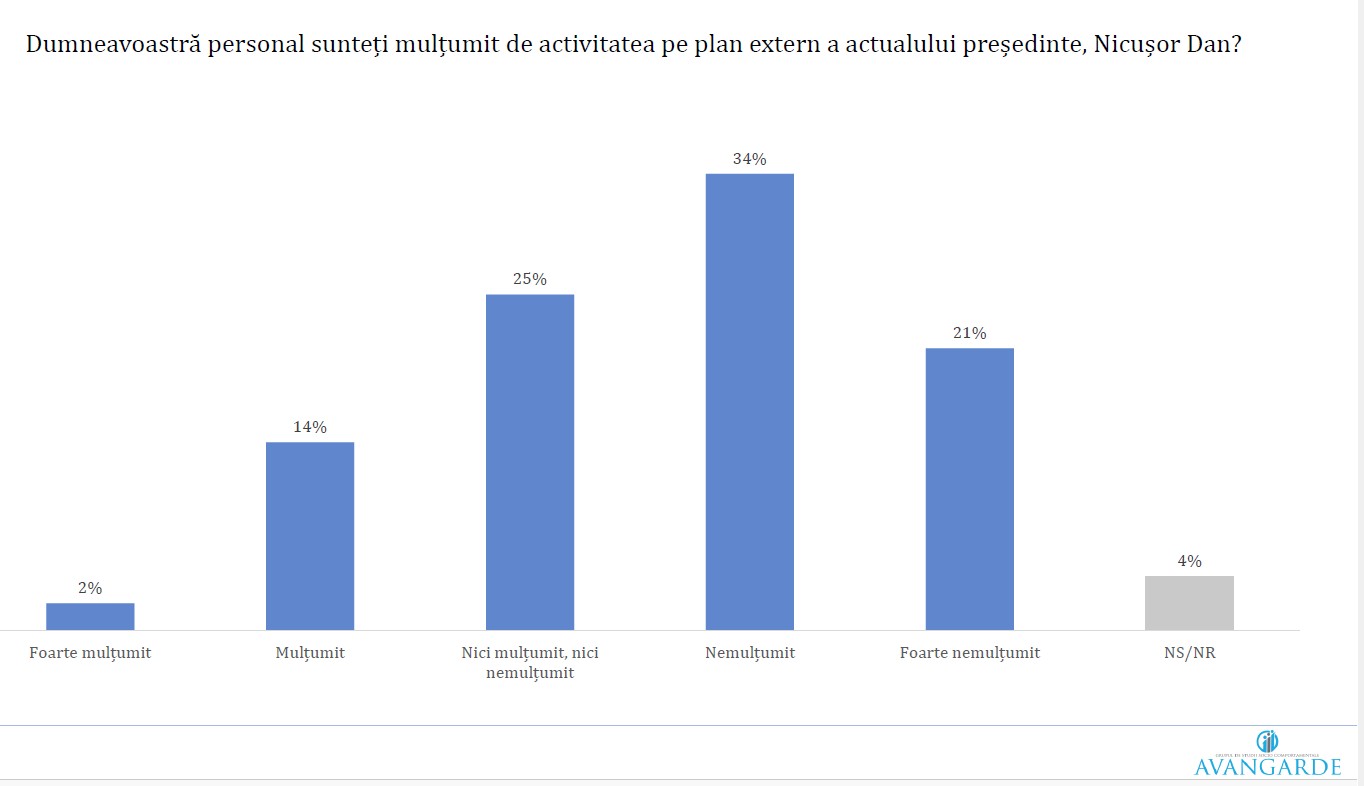 Absența președintelui Nicușor Dan de la Forumul Economic Mondial de la Davos pare să fi fost primită cu o dezaprobare masivă, 69% dintre cetățeni considerând că participarea șefului statului la acest eveniment de anvergură era absolut necesară. Această nemulțumire se traduce și într-o evaluare critică a activității externe generale a președintelui, peste jumătate dintre români declarându-se nemulțumiți sau foarte nemulțumiți de modul în care România este reprezentată peste hotare. Criticile sunt deosebit de aspre în rândul persoanelor cu studii medii, unde procentul celor nemulțumiți atinge pragul de 60%, subliniind o percepție de izolare sau ineficiență a diplomației de la București în raport cu marile capitale ale lumii.