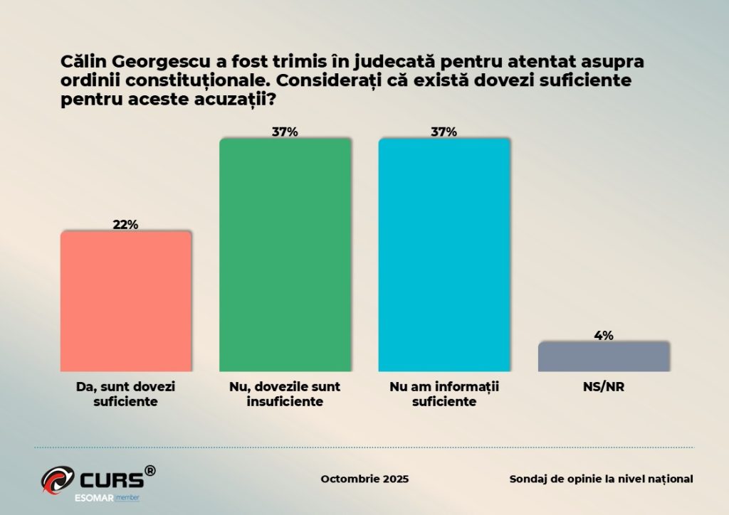 În ceea ce privește cazul Călin Georgescu, trimis în judecată pentru atentat asupra ordinii constituționale, doar 22% dintre respondenți cred că există dovezi solide pentru acuzații, în timp ce 37% le consideră insuficiente, iar alți 37% recunosc că nu dețin informații suficiente pentru a se pronunța. Nivelul ridicat al incertitudinii reflectă prudență, dar și o neîncredere generală în sistemul judiciar și în transparența informațiilor publice.