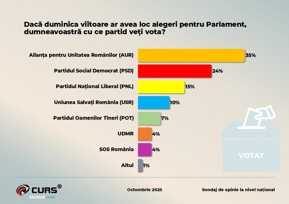 Scena politică românească traversează o perioadă de tensiune și schimbare, iar cel mai recent sondaj al Centrului de Sociologie Urbană și Regională (CURS), realizat între 14 și 26 octombrie 2025, confirmă o reașezare vizibilă a preferințelor electorale. Studiul, desfășurat pe un eșantion reprezentativ de 1.036 de respondenți adulți din toată țara, relevă o creștere constantă a Alianței pentru Unitatea Românilor (AUR), care ar fi votată de 35% dintre români dacă duminica viitoare s-ar organiza alegeri parlamentare.