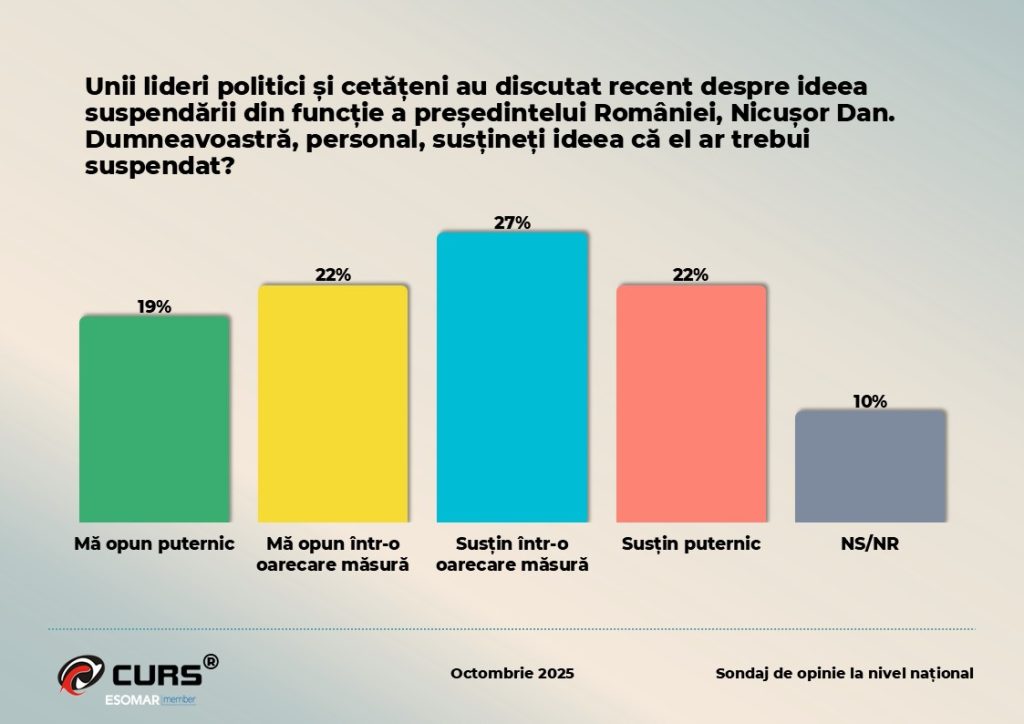 Un alt capitol sensibil al sondajului privește atitudinea față de posibila suspendare a președintelui Nicușor Dan. Aproape jumătate dintre români, 49%, ar susține o astfel de măsură, în timp ce 41% se opun și 10% nu au o opinie formată. Dintre cei care ar sprijini suspendarea, 22% o susțin ferm, iar 27% într-o oarecare măsură. În tabăra opusă, 22% se opun moderat, iar 19% resping categoric ideea. Datele arată o polarizare accentuată a electoratului, semn al unei societăți divizate și tot mai tensionate politic.