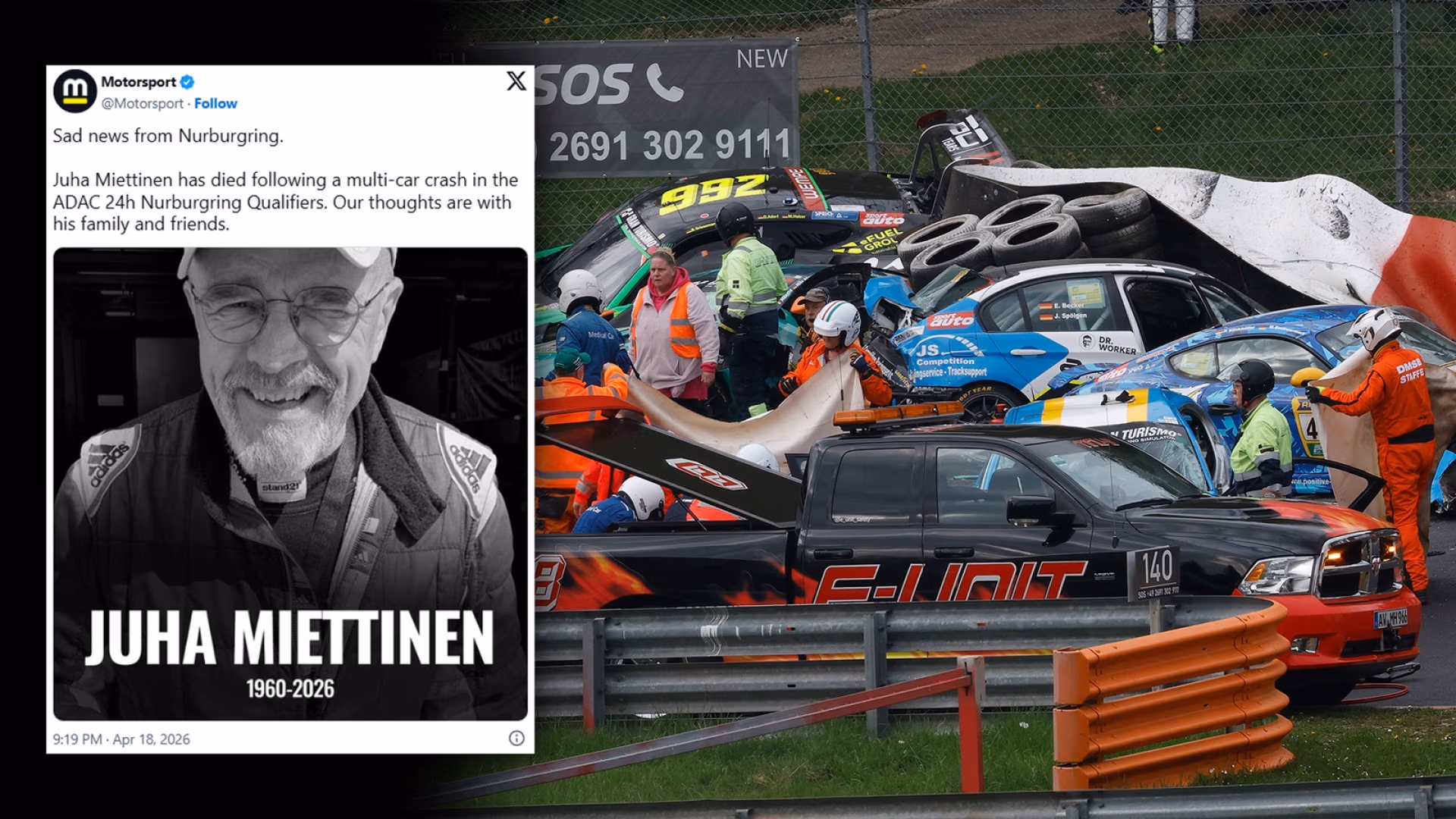 Lumea sportului cu motor este în doliu după ce pilotul de curse Juha Miettinen a decedat în urma unui accident grav petrecut duminică, 19 aprilie 2026, în timpul sesiunilor de calificare pentru cursa de 24 de ore de la Nürburgring. Incidentul, care a avut loc pe celebrul circuit din Germania, a implicat o coliziune în lanț între șapte autovehicule, forțând conducerea cursei să oprească imediat competiția. Deși echipele de salvare au intervenit în câteva secunde, medicii nu au reușit să îl salveze pe Miettinen, care a fost extras din mașină și transportat la centrul medical al circuitului. Din păcate, eforturile de resuscitare au eșuat, iar decesul acestuia a fost confirmat ulterior de organizatorii ADAC. Ceilalți șase piloți implicați în carambol au fost transportați la spitalele din apropiere pentru investigații, însă oficialii au asigurat că niciunul dintre aceștia nu se află în stare critică.